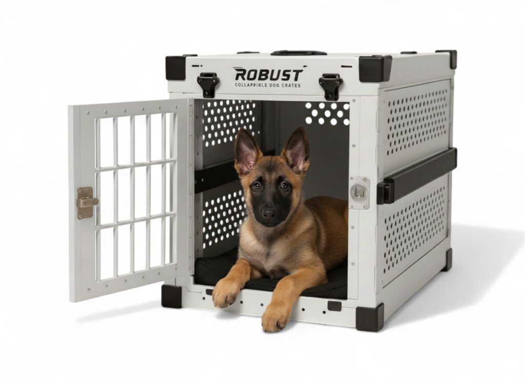 The ROBUST crate is made of high-quality aluminum and reinforced corners, making it extremely resistant to bites, scratches, and impacts. It’s a sturdy dog crate, designed to last and withstand daily use, even with energetic dogs.